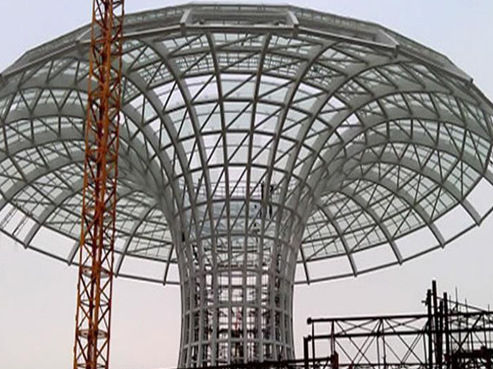 二、球形网架结构因其结构新颖,受力合理,自重轻、用钢量低等优点。如大型体育场馆球形平度螺栓球网架、公共场馆球形网架、电厂平度螺栓球网架、水泥工业球形网架、仓储物流球形网架、平度干煤棚工业球形网架、平度收费站平度加油站球形网架、展览中心、影剧院、商场、航站楼、候车厅、工厂平度车间、仓库、电视塔等球形螺栓球节点网架。国内球形网架结构主要分为:平度焊接球节点网架及螺栓球节点网架两种。螺栓球节点网架其构件工厂内加工量较大,现场安装便捷,适用于现场工期紧,平度施工条件、用电量受制约,网架形状复杂、平度杆件定位困难的异形结构。螺栓球节点球形网架系统基本由平度杆件、螺栓球、支撑支座等组成。按照节点形式可分为交叉平度桁架体系、四角锥体系、三角锥体系等。支撑方式多为固定支座支撑。对于大面积、大跨度及有特殊受力或伸缩要求的网架结构可采用橡胶支座、滑移支座、球铰支座等支撑形式,以满足结构自身的受力稳定、均衡,便于内力释放等设计要求。